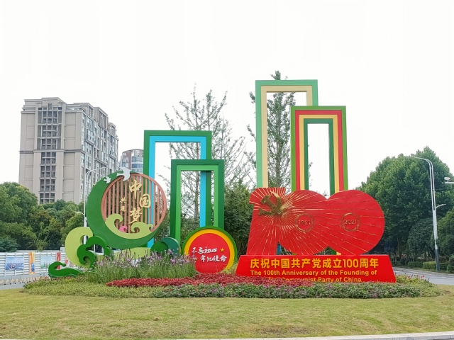 不忘初心來時路,同心共筑中國夢。位于建鄴區(qū)夢都大街揚子江大道路口高7米,占地面積100余平方米的主題景觀,在綠地基礎(chǔ)上突顯了“慶祝中國共產(chǎn)黨成立100周年”活動標(biāo)識等黨建元素;中國傳統(tǒng)紋樣圖案、彩色立體門框的設(shè)計,賦予整件作品立足傳統(tǒng)、開放包容的內(nèi)涵;蛇鞭菊、斑葉芒、彩葉草、夏堇等各式花卉錯落有致的鋪滿地面,烘托了喜迎建黨百年的喜慶氛圍。