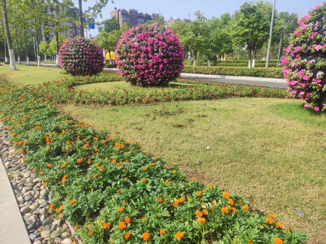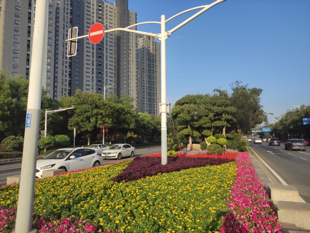 水韻路中分帶的花球也換上了新裝,10個(gè)巨大的牽牛花球被紅黃色的花帶簇?fù)碇?,在太陽下盡情地綻放著,像是小孩的笑臉,歡快地為祖國母親慶生。