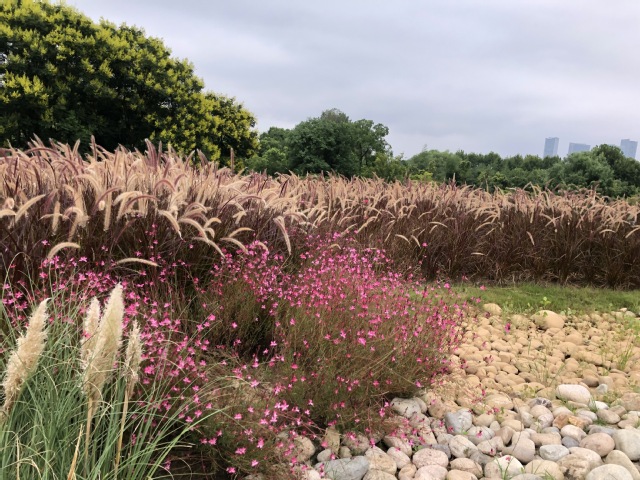 紫金文創(chuàng)園屋頂花園提升項(xiàng)目將植物配置進(jìn)行全面提檔升級(jí),把原有枯黃退化、高低不平的狗牙根草地進(jìn)行翻新整地,栽植了薄雪萬年草,紅葉景天,粉黛亂子草、紫穗狼尾草等灌木和草本植物,既保證了屋頂承重的要求,又形成了野趣的屋頂景觀效果。