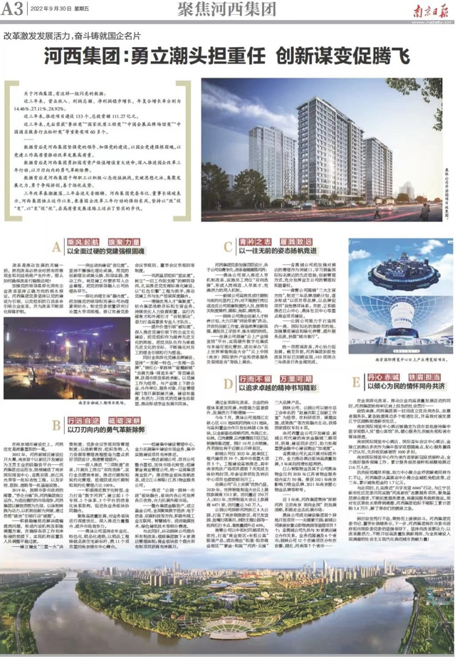 在南京城市建設(shè)史上,河西注定是濃墨重彩的一筆。2002年,河西新城區(qū)建設(shè)拉開大幕,南京首個以新區(qū)開發(fā)建設(shè)為主責(zé)主業(yè)的投融資平臺——河西集團應(yīng)運而生,陸續(xù)建成了南京國際博覽中心、青奧雙塔、濱江風(fēng)光帶等一批標(biāo)志性工程,以及學(xué)校、醫(yī)院、道路等一批基礎(chǔ)設(shè)施。2019年,按照市委市政府的部署,“事企分離”后,河西集團獨立運作。為適應(yīng)激烈的市場競爭,河西集團以解放思想為先導(dǎo),以體制轉(zhuǎn)換為動力,以機制創(chuàng)新為突破,通過思想“破冰”引領(lǐng)行動“破題”?!e極穩(wěn)健規(guī)范解決混編混崗問題,形成內(nèi)設(shè)機構(gòu)及職能調(diào)整方案,在確保各項工作有序銜接的前提下,實現(xiàn)機構(gòu)設(shè)置及人員調(diào)整平穩(wěn)過渡。 ——建立健全“三重一大”決策制度、黨委會議事規(guī)則等管理制度;以戰(zhàn)略管控、組織架構(gòu)、人力資源等管理流程塑造為重點抓好頂層設(shè)計,倒逼管理提升。 ——深入推進“三項制度”改革,開展員工崗位“雙向選擇”,實行全員績效考核。推進任期制和契約化管理,經(jīng)理層成員任期制和契約化管理占比100%?!e極推進數(shù)字化轉(zhuǎn)型,全力打造“數(shù)字河西”,建立起1個專網(wǎng)、2個體系、3個平臺的信息化體系架構(gòu),促進各業(yè)務(wù)板塊協(xié)同融合。聚焦高質(zhì)量發(fā)展,對業(yè)務(wù)板塊進行深度優(yōu)化,深入推進力量整合,提升市場競爭力?!獖W體公司堅持走專業(yè)化、特色化、精品化道路,以精品工程鑄就品質(zhì)住宅新標(biāo)桿,攜11個項目重回南京樓市中心舞臺?!M建集中建設(shè)管理中心,全力拓展集中建設(shè)市場業(yè)務(wù),集中實施建設(shè)項目有序推進?!七M新城公司、項目公司整合重組,加快市場化轉(zhuǎn)型;組建紫金商業(yè)管理公司,統(tǒng)一運營集團商業(yè)資產(chǎn);推進物業(yè)板塊戰(zhàn)略改革,成立江山智聯(lián)(江蘇)物業(yè)服務(wù)公司?!七M“公園—園林—市政”板塊融合,板塊內(nèi)各公司發(fā)揮各自優(yōu)勢,合力拓展外部市場。——整合集團金融資產(chǎn),成立基金公司,全面聚焦數(shù)字經(jīng)濟、電子信息、雙碳科技等方向,積極布局工業(yè)互聯(lián)網(wǎng)、智慧城市、清潔能源技術(shù)、綠色建筑技術(shù)等細(xì)分賽道。與此同時,啟動園林公司混合所有制改革;理順集團旗下6家酒店管理體制;商業(yè)板塊首個混合所有制項目招商有序展開。