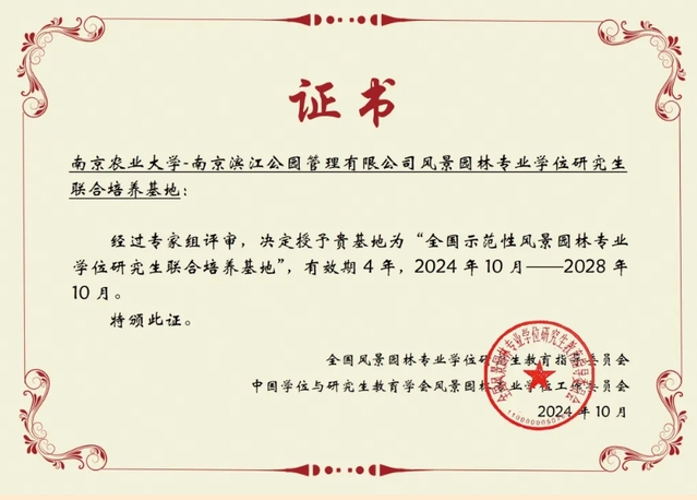 近日,全國風(fēng)景園林專業(yè)學(xué)位研究生教育指導(dǎo)委員會正式公布了2024年“全國示范性風(fēng)景園林專業(yè)學(xué)位研究生聯(lián)合培養(yǎng)基地”名單。南京濱江公園管理有限公司與南京農(nóng)業(yè)大學(xué)合作共建的“南京農(nóng)業(yè)大學(xué)—南京濱江公園管理有限公司風(fēng)景園林專業(yè)學(xué)位研究生聯(lián)合培養(yǎng)基地”,憑借卓越的聯(lián)合培養(yǎng)成效和深厚的校企合作基礎(chǔ),再次獲此資質(zhì)。