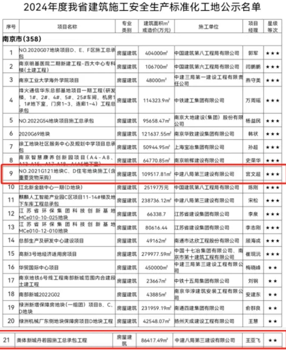 根據(jù)《南京市建設工程市級標準化工地評審辦法》,經(jīng)過嚴格評審程序,南京市城鄉(xiāng)建設委員會公布了2024年下半年南京市房屋市政工程安全文明標準化工地名單。河西集團奧體建設開發(fā)的丹若園、江尚紫薇、瑞香園、錦尚紫蘭四個項目脫穎而出,獲此殊榮。這些項目涵蓋不同施工階段,均展現(xiàn)了奧體建設對安全文明施工的高度重視,為集團后續(xù)同類項目施工管理樹立了良好典范。